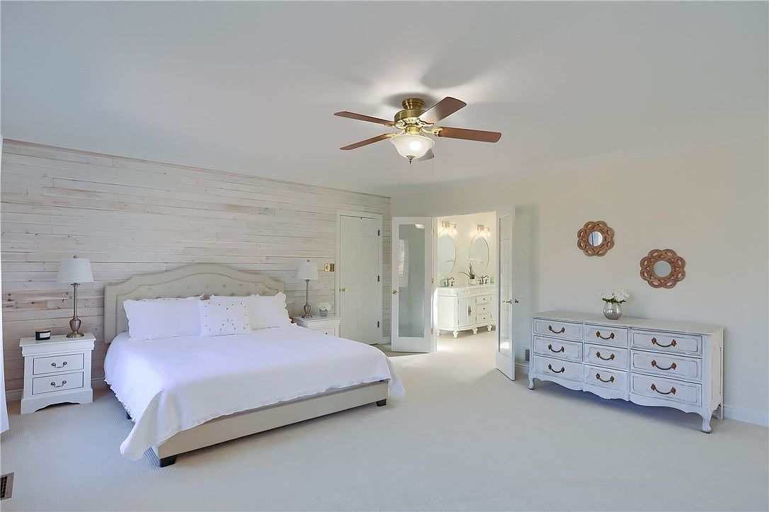 The spacious master bedroom features a serene color palette of soft whites and light grays, accentuated by the textured, horizontally-planked accent wall behind the bed. The large bed, dressed in crisp white linens, anchors the room, flanked by two matching white nightstands with classic table lamps. A white, vintage-inspired dresser complements the calm, airy feel and is adorned with subtle decorative wall mirrors above it. Plush carpeting covers the floor, enhancing comfort and cohesion. Ceiling fan lighting provides both function and style, while French doors reveal a bright, open ensuite bathroom with double vanities, contributing to the room’s peaceful and inviting atmosphere.