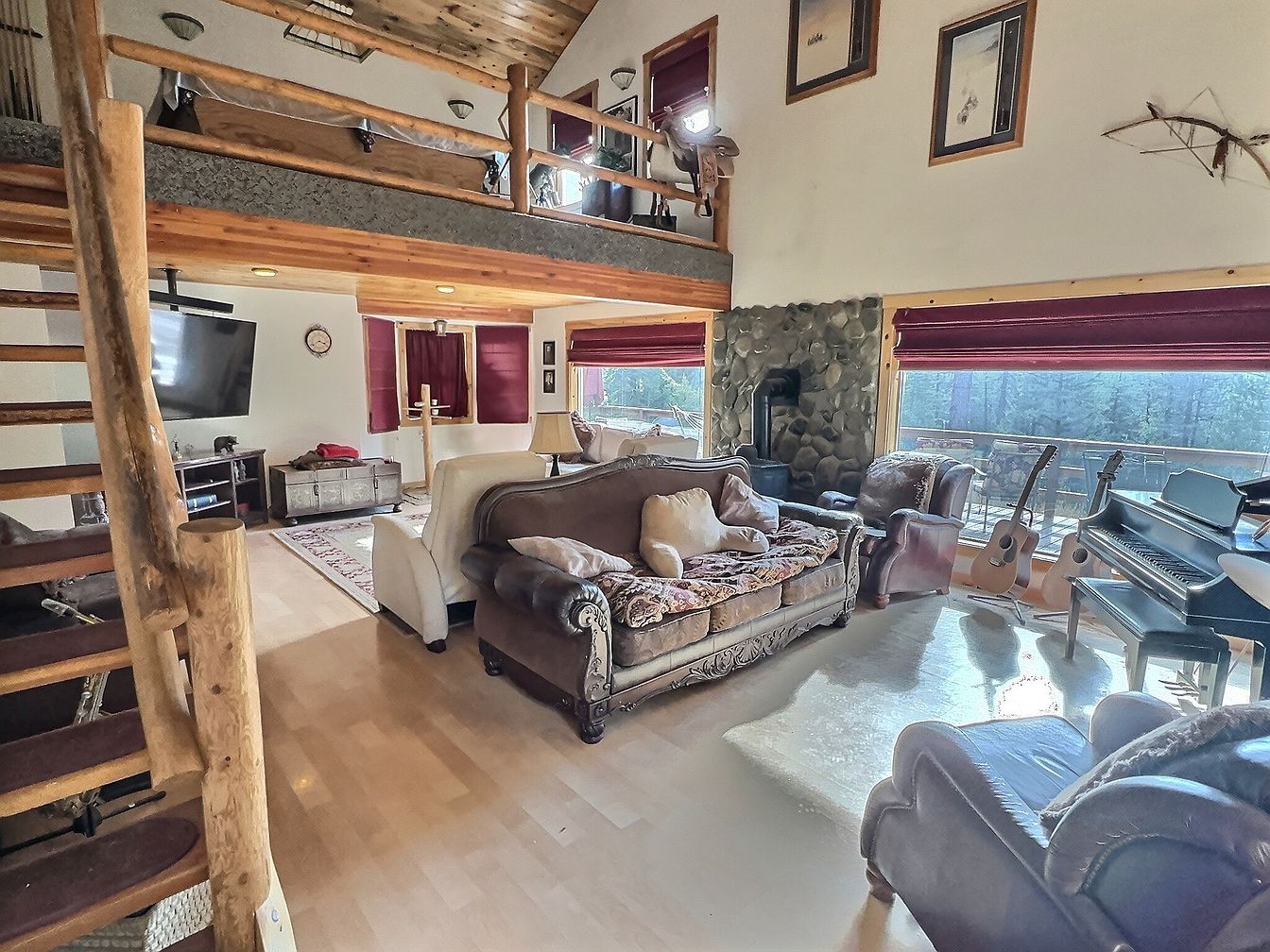 This spacious living room features a cozy, family-friendly layout designed for relaxation and social gatherings. The aesthetic blends rustic charm with modern comfort, highlighted by a stunning stone fireplace and a wooden loft overlooking the area. Rich wooden beams create an inviting ambiance, complemented by large windows with deep red shades that invite natural light while ensuring privacy. Soft, plush couches and armchairs are surrounded by a warm area rug, providing a perfect gathering spot. The room also integrates musical elements, with a piano and acoustic guitars set nearby, creating an ideal environment for family entertainment.
