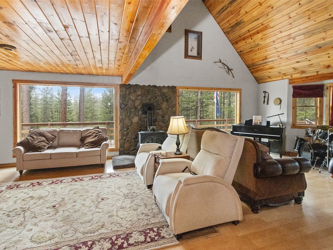 This inviting living room features a spacious layout with elegant wooden accents and an inviting atmosphere. A large window frames a breathtaking view of the surrounding woods, allowing natural light to flood the space. The high, vaulted ceiling, adorned with rich wooden beams, enhances the openness. Cozy seating includes a plush sofa and two leather armchairs, accented with decorative pillows, inviting family gatherings. A black piano and a drum set add a creative touch, perfect for musical moments. The warm color palette of browns and reds creates a homey feel, making this space ideal for family bonding.