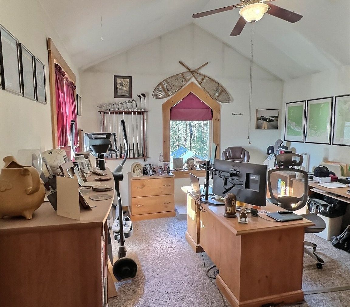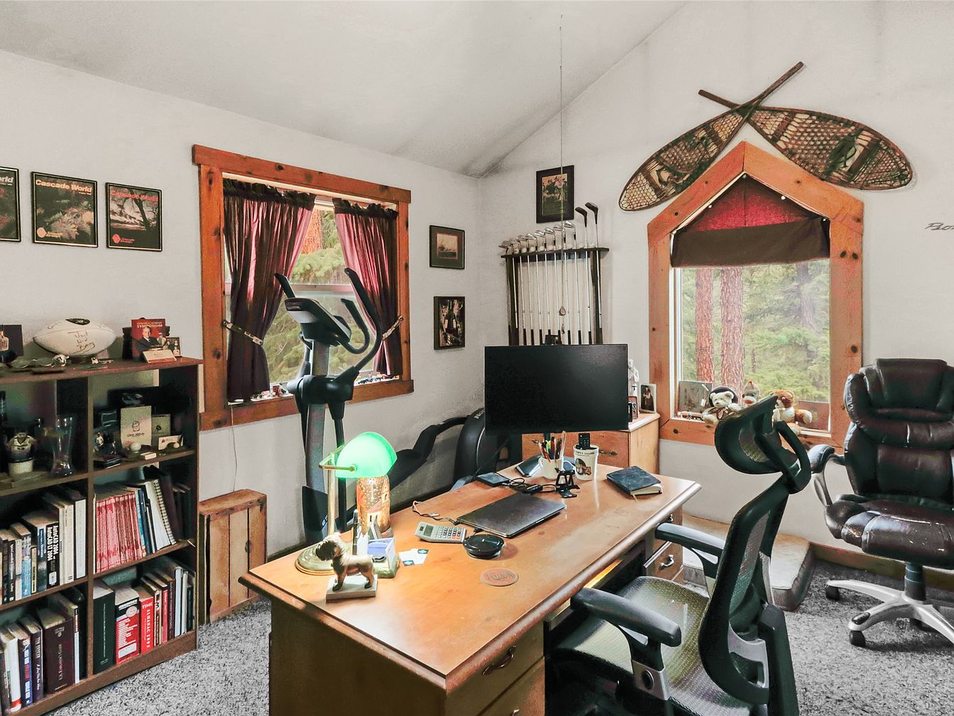 This inviting home office features a high, vaulted ceiling complemented by wooden beams, enhancing openness and warmth. Light streams in through a large window, showcasing serene outdoor views. Richly colored, dual-layer window treatments provide both functionality and style. The space is intelligently organized with minimalist furniture, including a wooden desk and ergonomic chairs, ensuring comfort during long work hours. A fitness machine and shelves adorned with golf clubs and personal artifacts reflect a balanced lifestyle. Subtle earth tones throughout harmonize with the cozy carpet, making it a perfect environment for productivity and family interaction.