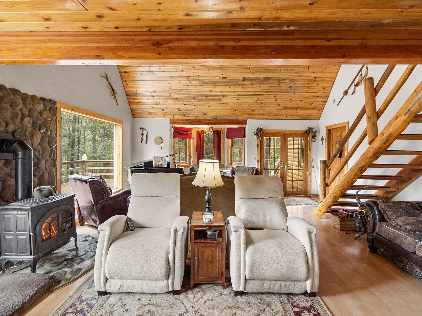 This inviting living room boasts a spacious layout featuring soft beige recliners, perfect for family gatherings. Complemented by a rich wooden ceiling, the space feels cozy and warm. A striking stone fireplace adds rustic charm, surrounded by large windows that invite natural light and views of the outdoors. The walls are adorned with subtle decor, enhancing the home’s character. A plush area rug anchors the seating area, while a wooden staircase leads to the upper levels. The neutral color palette, combined with pops of red in the drapery, creates a comfortable and friendly atmosphere ideal for family relaxation.