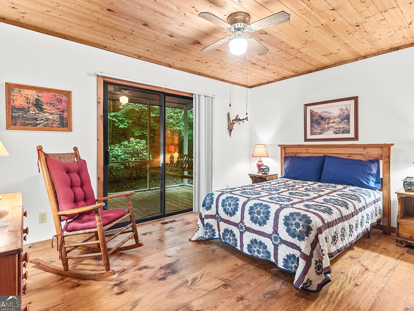 This bedroom features a warm, inviting vibe with natural wood flooring and a matching wooden ceiling that add rustic charm. The bed, dressed in a quilt with intricate blue and white patterns, serves as the focal point, complemented by deep blue pillows. On either side of the bed are quaint wooden nightstands with a lamp casting a warm glow. A red cushioned rocking chair sits near a large sliding glass door that opens to a peaceful outdoor space, inviting natural light and green views inside. The walls are painted crisp white, showcasing framed landscape artwork and a decor piece shaped like a fish, enhancing the cozy, cabin-like atmosphere.