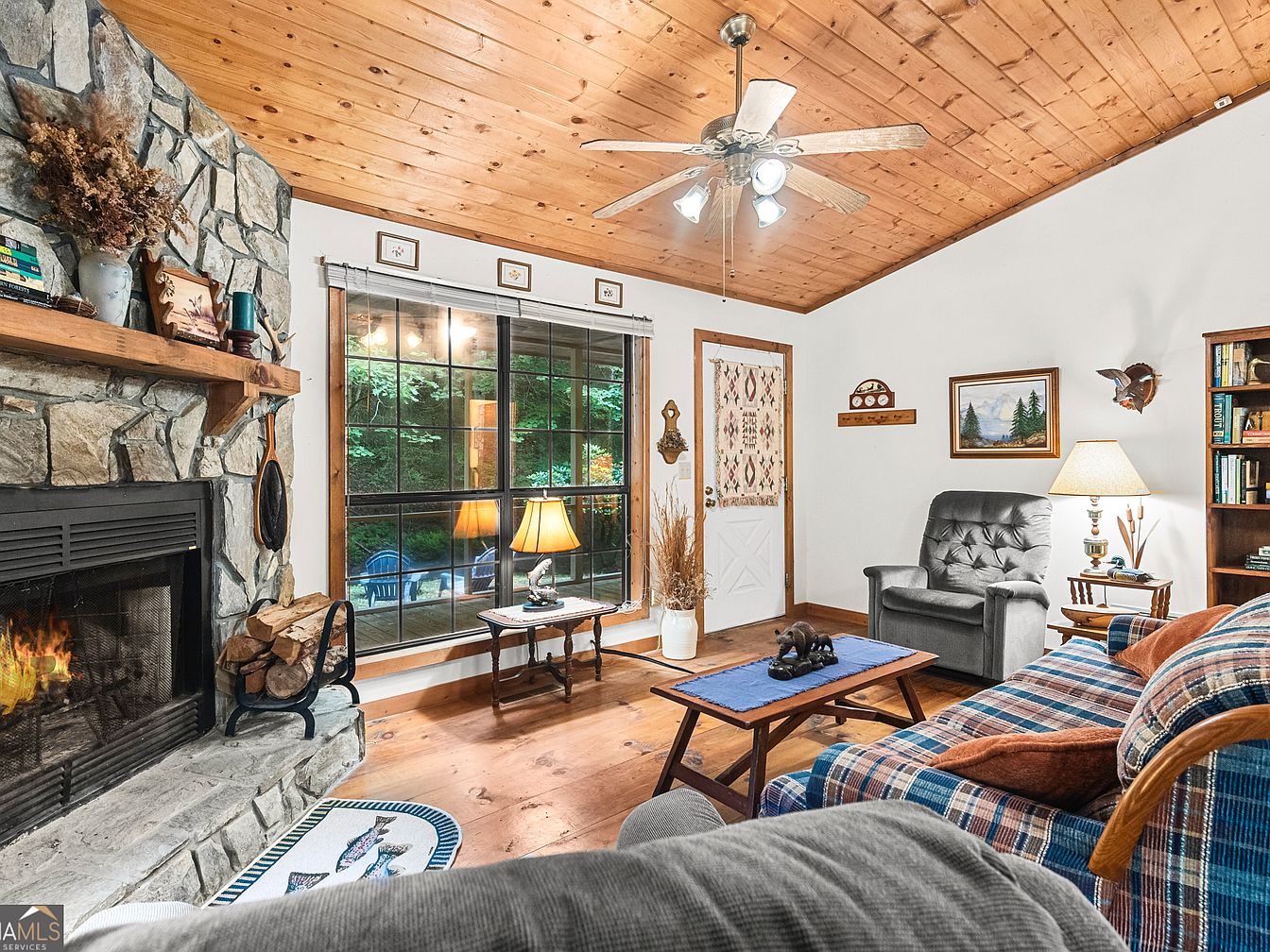 This inviting living room boasts a warm, rustic ambiance with a natural wood-paneled ceiling and hardwood floors. A large stone fireplace serves as the room’s focal point, accompanied by a neatly stacked woodpile for added charm. The space features comfortable, patterned upholstery on a sofa paired with several rust-colored accent pillows, complemented by a matching armchair. Soft lighting from a table lamp and ceiling fan illuminates the room warmly. A large window framed in wood allows abundant natural light and a serene view of the greenery outside, enhancing the cozy, cabin-like feel of the space.