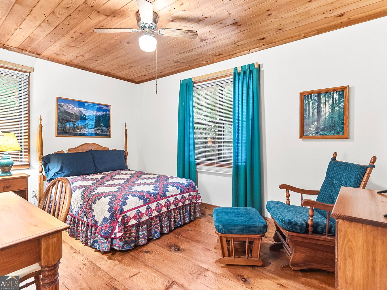 This inviting bedroom features a warm wooden ceiling and wide plank wood flooring, creating a rustic yet welcoming atmosphere. The bed has a traditional wooden headboard with a colorful patchwork quilt in red, blue, and white tones, complemented by navy blue pillows. Two windows with wood blinds and teal curtains let in natural light, enhancing the room’s brightness. A matching wooden rocking chair with blue cushions and an ottoman sits beside a simple wooden desk and nightstand with a turquoise lamp. Nature-themed artwork adds a peaceful touch to the minimalist, homey space.