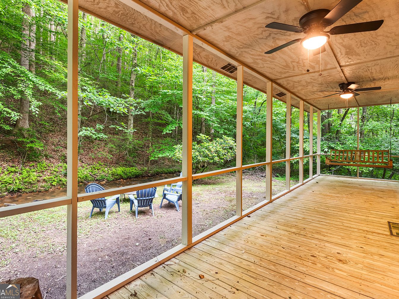 This inviting screened porch features light natural wood flooring with a matching ceiling that adds warmth and texture. Two ceiling fans ensure comfort, perfect for enjoying the fresh air during warmer months. The space is open to nature, framed by simple white posts that maintain the view of lush green trees just beyond the screen. A wooden swing hangs at one end, creating a peaceful retreat. Outside, a group of outdoor chairs is arranged near a gentle creek, offering a serene spot for gathering or relaxation while being immersed in the beauty of the surrounding forested landscape.