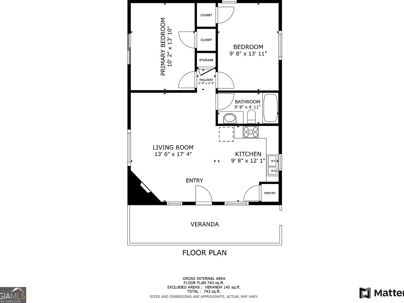 This thoughtful floor plan features a compact yet functional layout covering 743 square feet. Upon entry from the veranda, the spacious living room measuring 13’6” by 17’4” welcomes with a slightly angled exterior wall and window seating. Adjacent is the kitchen which is efficiently designed with clear zoning including a pantry and countertop space, sized 9’8” by 12’1”. Down the hallway, two bedrooms are accessed — the primary bedroom (10’2” by 13’10”) and a second bedroom just shy of 10 by 14 feet, both with closet space. The bathroom fits a tub, toilet, and sink, maintaining an overall balanced and functional footprint.