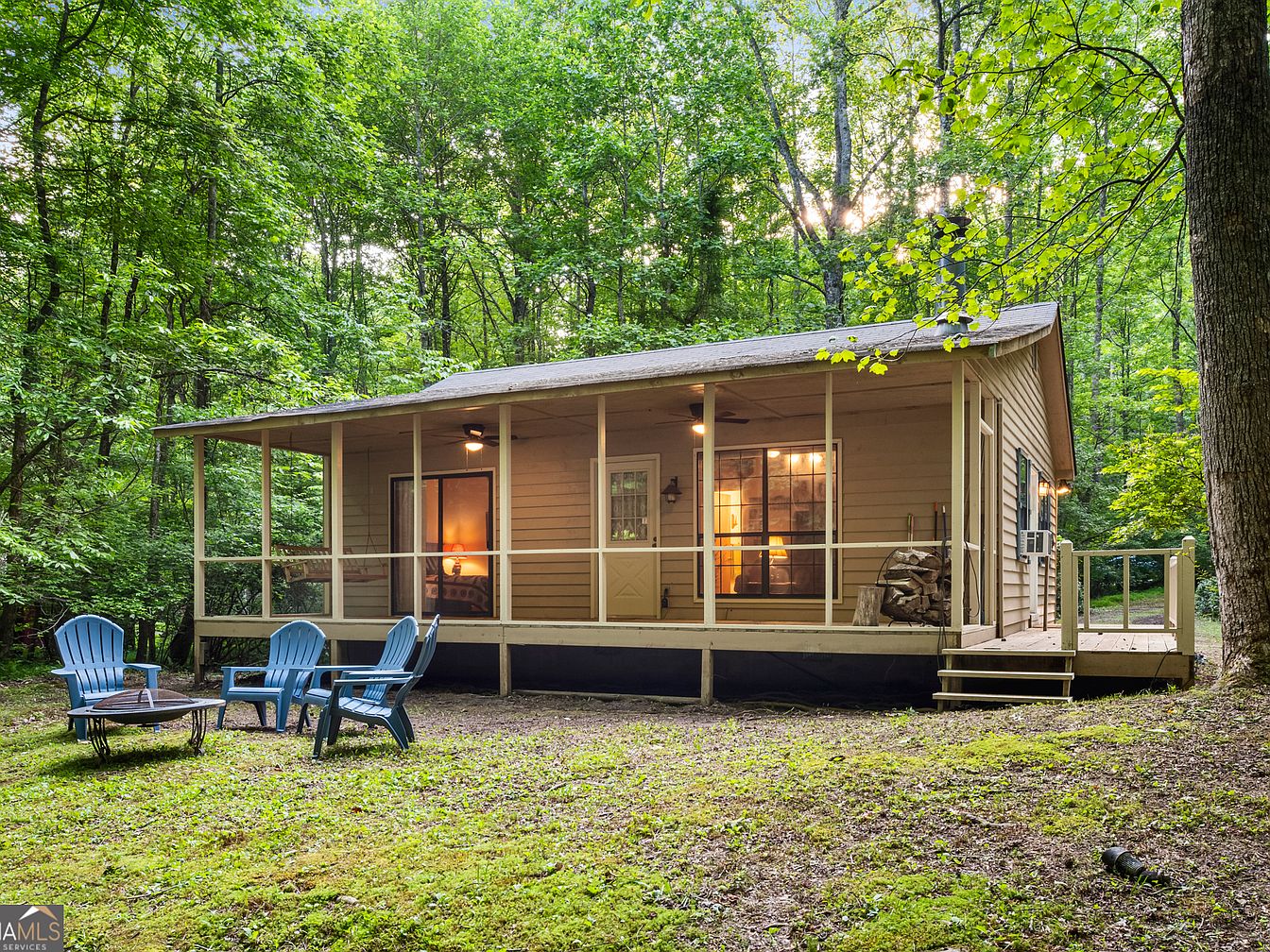 This charming front porch exudes rustic simplicity amid a lush, densely wooded backdrop. The beige siding complements the natural greenery, creating a harmonious connection between the home and its forested surroundings. The porch, elevated slightly on wooden stilts, features vertical supports and a welcoming entry door flanked by two large windows, offering inviting glimpses inside. Blue Adirondack chairs are arranged around a metal fire pit on the grass, suggesting a cozy spot for outdoor relaxation. Ceiling fans enhance comfort, while a neatly stacked pile of firewood hints at warmth during cooler evenings. This space feels intimate and nature-centric.