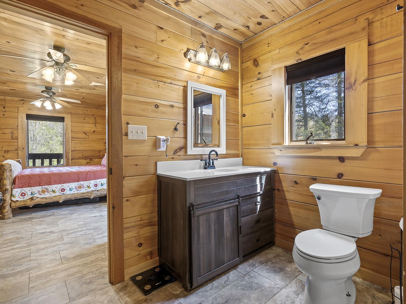 This charming bathroom features warm, natural wood walls and ceiling, creating a cozy cabin ambiance. The floor is tiled in a neutral tone that complements the wooden textures. A dark wood vanity with a white countertop and modern faucet anchors the space, while a rectangular mirror framed in white hangs above. A three-light fixture provides ample illumination. A window above the toilet offers a view of the outdoors and natural light, with a dark roller shade for privacy. Through the open doorway, a bedroom with a rustic log bed, colorful bedding, and ceiling fans is visible, continuing the rustic, inviting aesthetic.