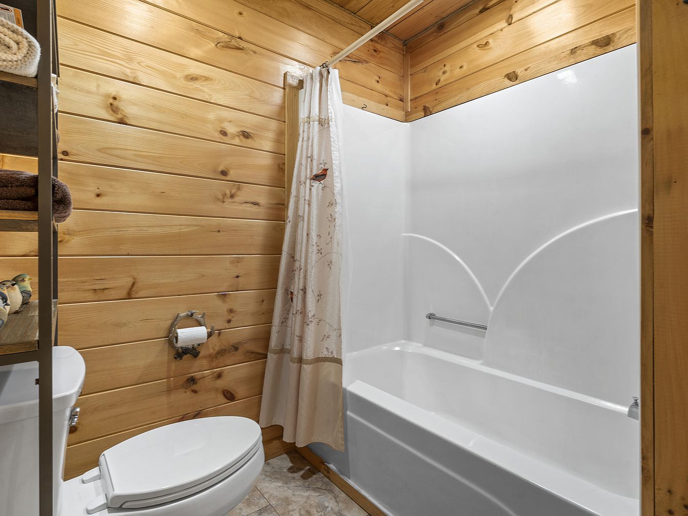 This bathroom combines rustic charm with simplicity, featuring warm, natural pine wood paneling on the walls and ceiling that infuses the space with a cabin-like atmosphere. The white bathtub and shower surround create a bright contrast and a clean, fresh feel. A nature-inspired shower curtain with bird motifs adds a subtle decorative touch. The white toilet sits comfortably next to a metal shelving unit stocked with folded towels and small decorative elements, optimizing both function and aesthetics. The beige tile flooring complements the overall neutral, earthy color palette for a welcoming, intimate bathing area.