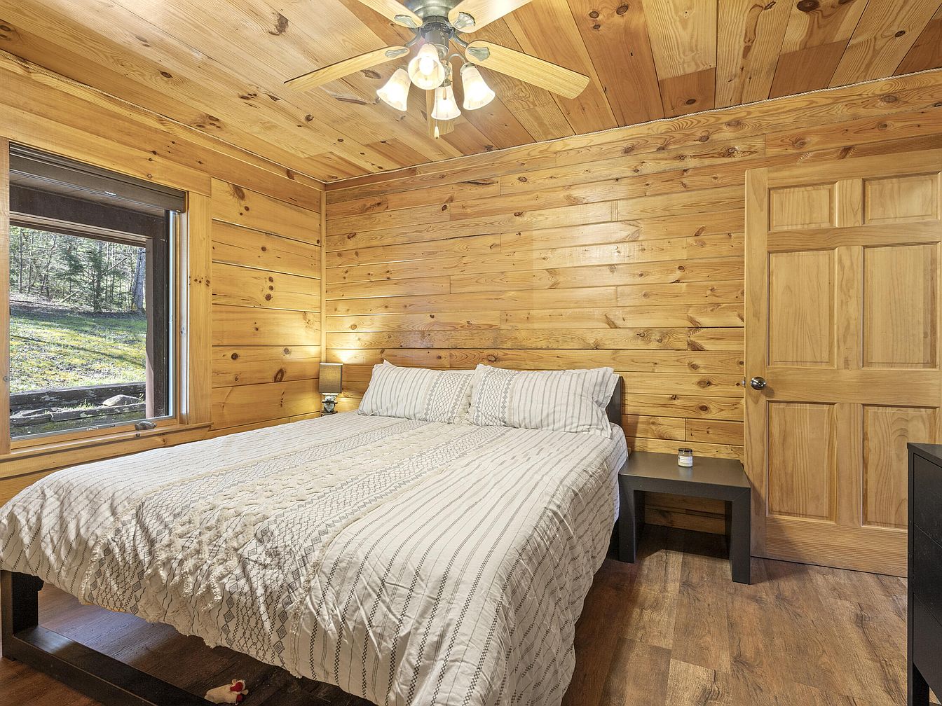 This bedroom embraces a warm, rustic charm with natural wood paneling covering all walls and the ceiling, creating an inviting cabin atmosphere. A large window beside the bed offers a peaceful view of greenery outside and allows natural light to fill the space. The bed is positioned centrally with a monochromatic, patterned comforter and matching pillows in neutral shades. Dark minimalist nightstands flank the bed, with a small lamp on one side and a candle on the other. A ceiling fan with light fixtures adds both function and a touch of traditional style to the wood-clad room.
