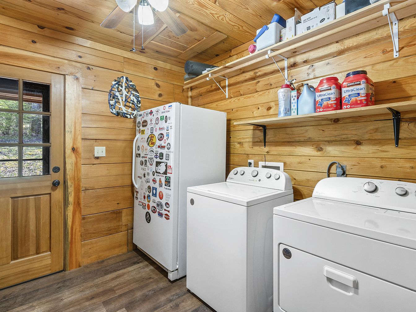 This cozy laundry room features natural wood paneling on the walls and ceiling, showcasing a rustic cabin charm with warm, honey-toned textures. The flooring combines natural wood hues with modern durability. The space is equipped with a white washing machine and dryer side by side, complemented by a white upright freezer adorned with a variety of colorful stickers. Wall-mounted shelves provide practical storage, holding laundry supplies and household essentials neatly arranged above the machines. A wooden door with glass panes invites natural light while maintaining the room’s cabin-inspired aesthetic, enhanced by a ceiling fan for ventilation.