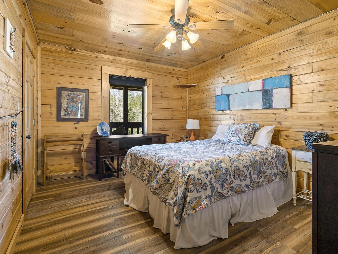 This inviting bedroom features walls, ceiling, and trim all clad in warm, golden-toned wood planks creating a rustic yet polished cabin feel. The wood floors complement this aesthetic with a slightly darker stain and natural grain. A double bed dressed in floral-patterned bedding with soft pastel tones sits centrally against one wall, accented by a tall, contemporary painting in blues and neutrals. A wooden desk sits by the window offering workspace with nature views. The room is softly illuminated by a ceiling fan with lights, while subtle decorative touches and minimal clutter enhance its tranquil charm.