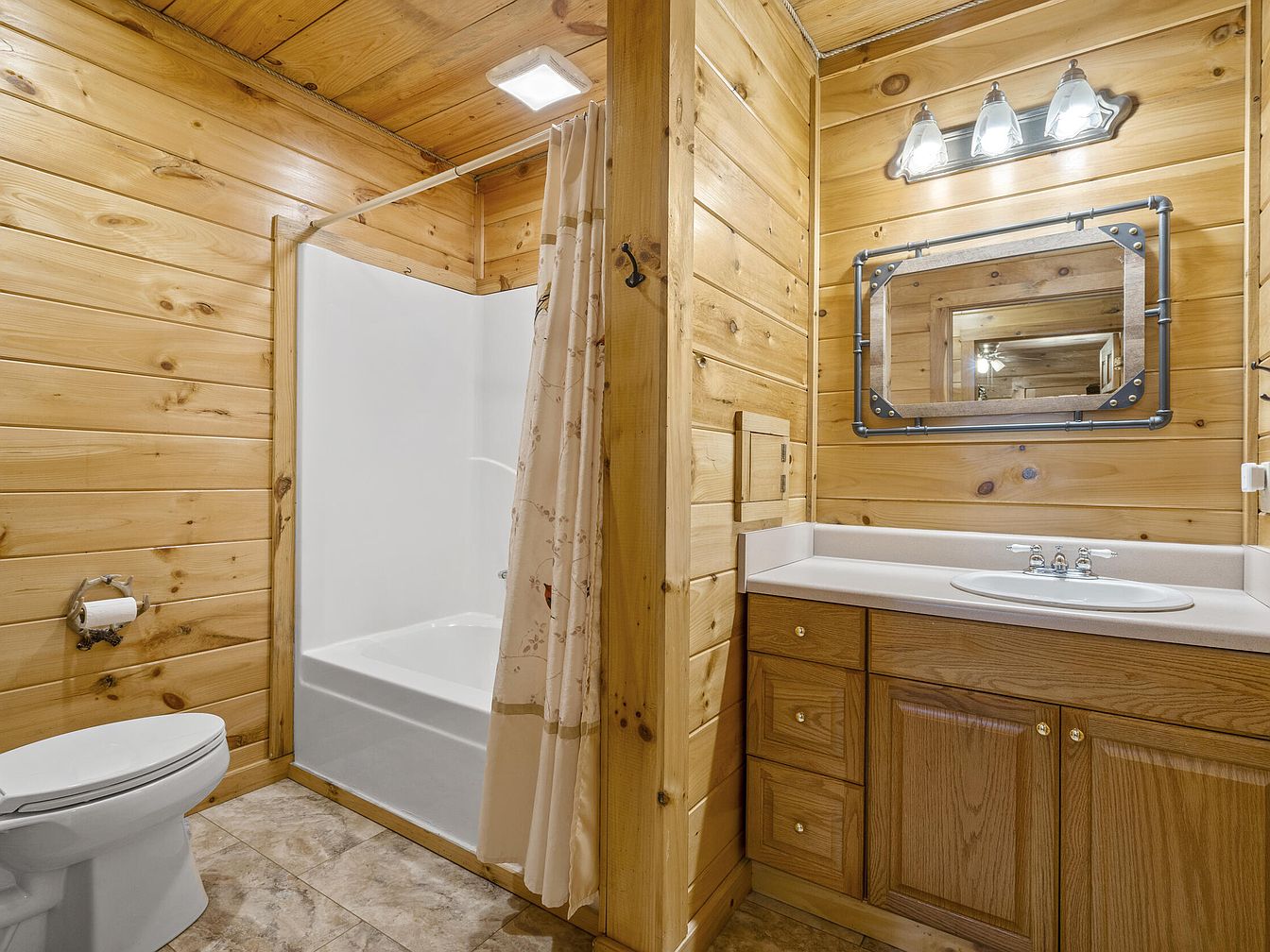 This bathroom features a warm, cabin-inspired design with natural wood paneling covering all the walls and ceiling, creating a cozy, rustic ambiance. The room is divided into two functional zones: a white bathtub with a floral-patterned shower curtain nestled in one corner, and a wooden vanity with a light-colored countertop and built-in sink in the other. Above the vanity, a rectangular mirror framed with an industrial style metal and wood design complements the brass hardware on the cabinetry. Neutral tile flooring grounds the space, while overhead lighting adds brightness and highlights the wood’s natural grain.