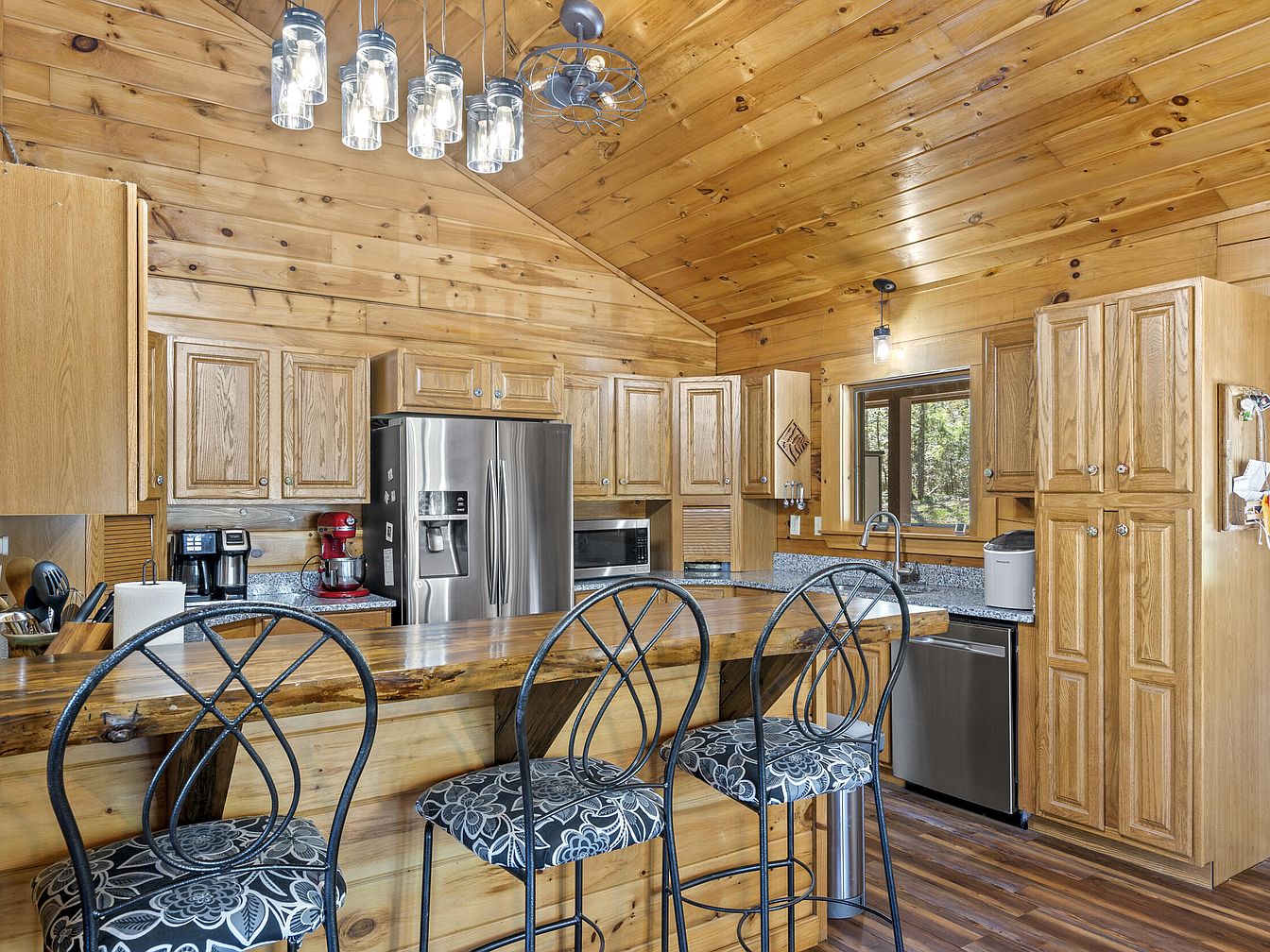 This cozy kitchen features a warm, rustic aesthetic with natural wood paneling covering the walls and vaulted ceiling, creating a cabin-like atmosphere. The cabinetry is crafted from matching light oak wood, providing ample storage while blending seamlessly with the wood-paneled surroundings. Stainless steel appliances, including a French door refrigerator, dishwasher, and microwave, introduce modern touches amid the natural finishes. The granite countertops offer a durable workspace, complemented by a broad wooden island serving as a breakfast bar with three wrought iron stools cushioned in a floral pattern. Pendant and track lighting add both functionality and a contemporary flair to this inviting space.