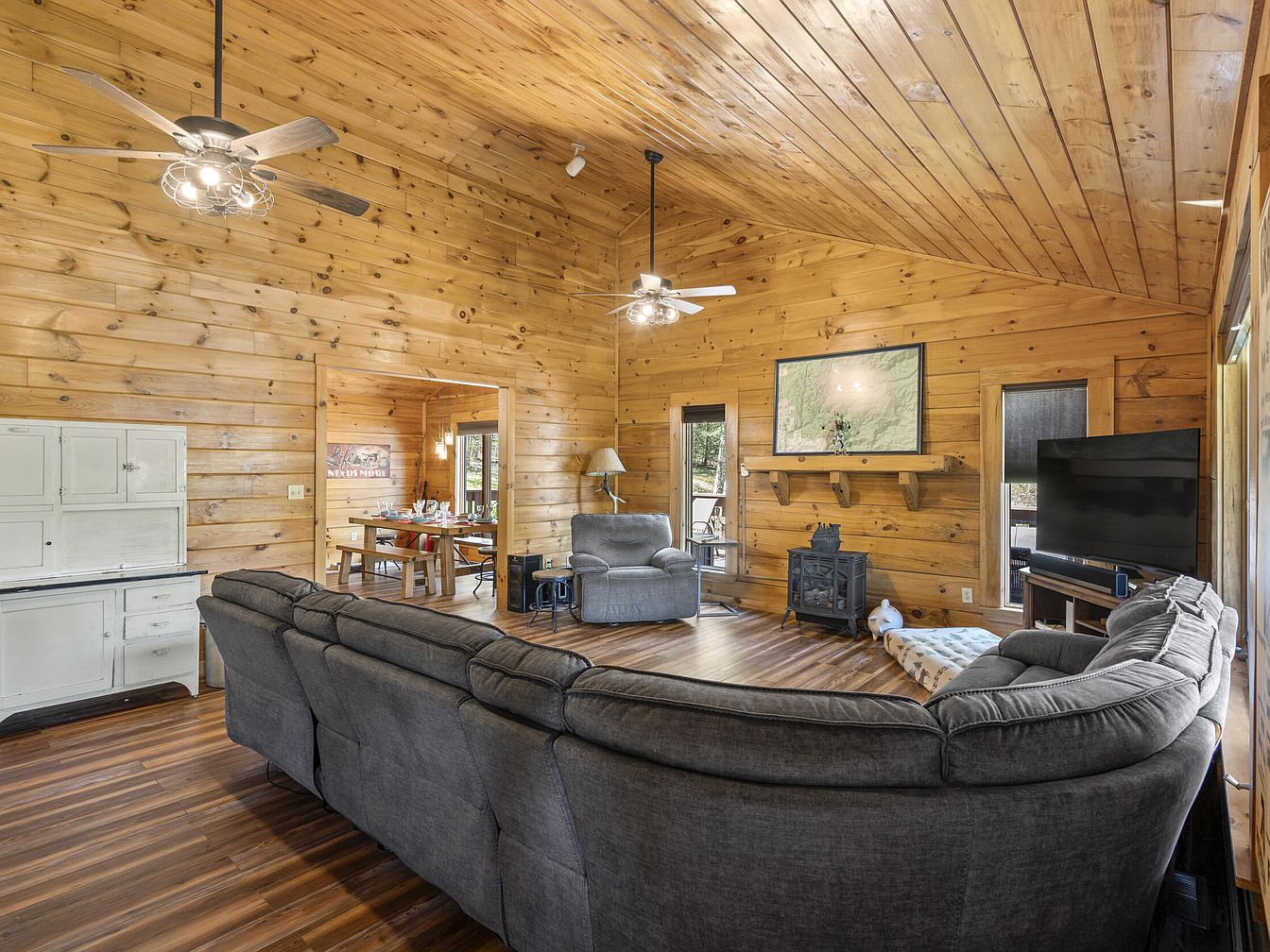 This living room exudes rustic warmth with its knotty pine wood-paneled walls and vaulted ceiling, creating a cabin-like atmosphere. The space features a large, comfortable gray sectional sofa that anchors the seating area, complemented by a matching recliner. Dark wood flooring adds depth and contrasts with the lighter wood walls and ceiling. Two ceiling fans with metal cage light fixtures provide both illumination and air circulation. A small black electric stove heater sits beneath a floating wooden shelf holding a framed map, enhancing the cozy ambiance. The room opens into a dining area visible through a wide doorway, demonstrating an open, inviting layout.