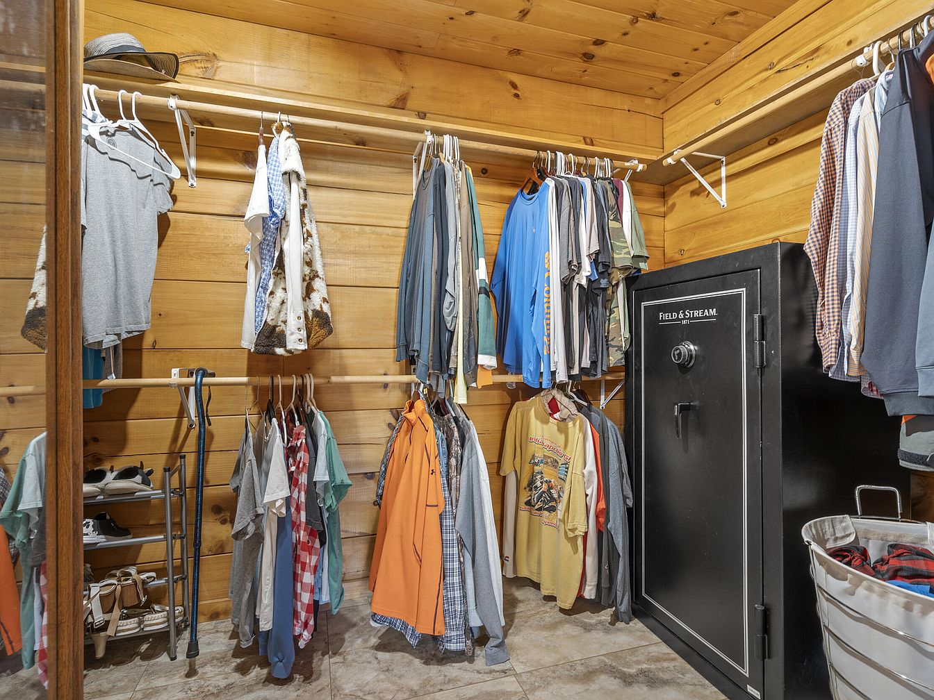 This walk-in closet features warm, natural wood paneling on the walls and ceiling, creating a cozy, cabin-like atmosphere. Two levels of wooden hanging rods maximize clothing storage, with casual shirts, jackets, and t-shirts neatly arranged by type and color. A sturdy, black Field & Stream safe stands prominently in the corner, adding secure storage balance to the space. The floor is tiled with neutral-toned, stone-like tiles, complementing the wood textures while ensuring durability. Additional shelving on the left holds shoes, and a laundry hamper sits conveniently to the right, enhancing the closet’s practical design.