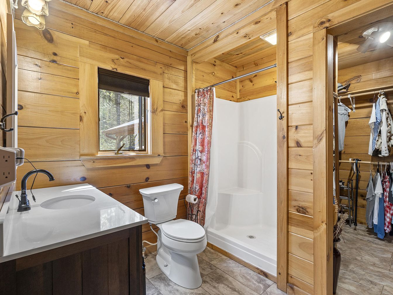 This cozy bathroom features natural wood paneling on walls and ceiling, highlighted by their warm honey tones that complement the rustic cabin aesthetic. A modern white shower with a built-in seat is enclosed by a colorful floral shower curtain. Adjacent to the shower, a white toilet sits under a small window with a black shade that brings natural light into the space. A dark wood vanity topped with a sleek white countertop and a black faucet adds contrast. The bathroom seamlessly connects to a walk-in closet lined with wooden racks and clothes, maintaining a cohesive rustic style throughout.