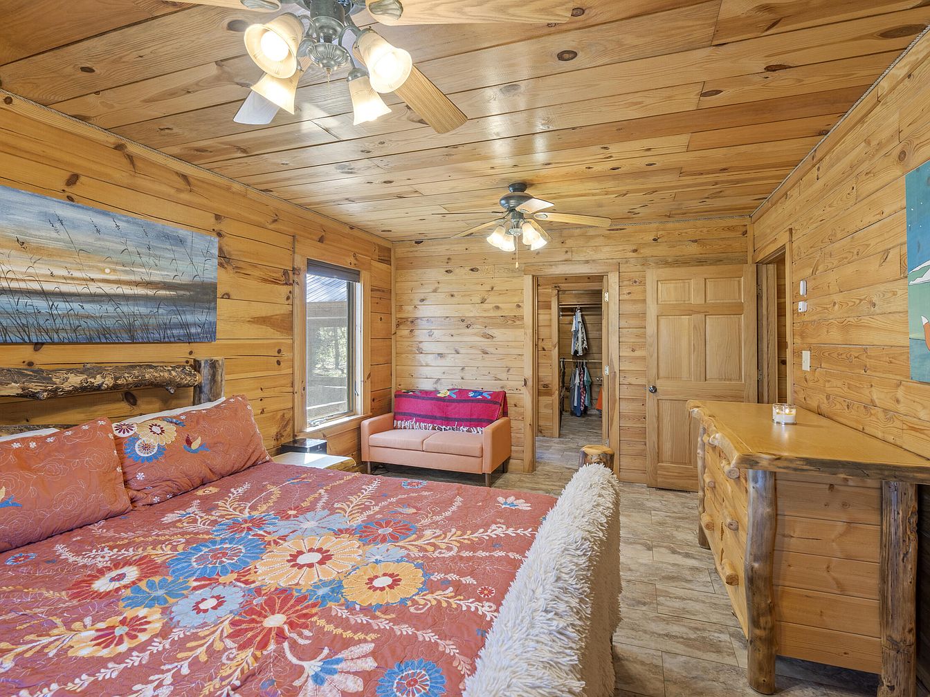 This bedroom exudes rustic charm with natural pine wood paneling covering the walls and ceiling, creating a warm and inviting atmosphere. The floor mimics the look of light wood or stone tiles, offering durability and style. A large bed with a colorful floral quilt in shades of red, blue, and yellow anchors the space, complemented by a log-style wooden headboard adding a handcrafted feel. Opposite the bed is a natural wood dresser showcasing live edge details, paired with a cozy orange loveseat adorned with a vibrant throw. Ceiling fans with light fixtures provide comfort and illumination, while two doorways hint at a walk-in closet and additional access points.