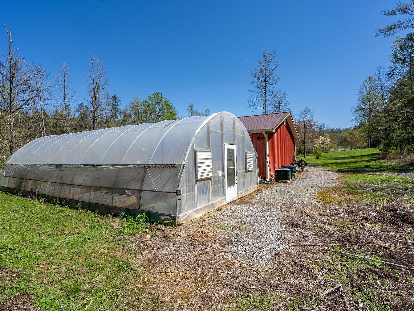 This section features a spacious greenhouse with a translucent plastic covering, allowing ample natural light for plant growth. The greenhouse has a rounded roof and a white framed door, complemented by ventilation windows on its sides for airflow control. Adjacent to the greenhouse is a rustic red wooden shed with a sloped metal roof, lending a charming farmhouse feel. The ground is a mix of gravel and scattered natural debris, leading into lush green grass that blends into the surrounding wooded landscape under a bright, clear blue sky, evoking a serene rural atmosphere.