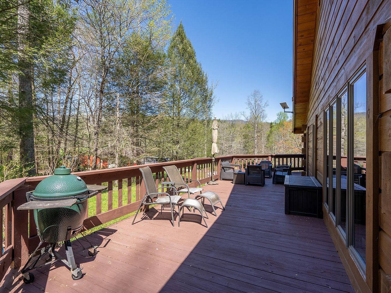 This spacious wooden deck stretches alongside the home, offering seamless indoor-outdoor living. The deck, constructed from warm-toned wood, complements the home’s rustic exterior, enhancing its natural charm. The area is furnished with two lounge chairs and matching footrests, perfect for indulging in the surrounding forest views. At one end, a green ceramic grill sits ready for outdoor cooking. Opposite the grill, a cozy seating arrangement with cushioned chairs and a small table invites social gatherings. The railing provides safety while allowing an unobstructed view of tall trees, lush greenery, and a clear blue sky, evoking tranquility and connection with nature.