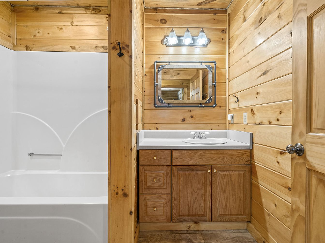 This charming bathroom features rich natural wood paneling that envelops the space in warmth, reminiscent of a cozy cabin. The vanity area includes a white countertop with an integrated sink, complemented by wooden cabinetry with brass knobs that provide subtle elegance. Above the sink, a rectangular mirror framed with industrial-style metal piping adds a modern yet rustic touch, illuminated by a trio of bright lights mounted on the wall. Adjacent to the vanity, a simple white bathtub with a smooth surface offers a clean, functional contrast. The earth-toned tile floor anchors the space, balancing the natural wood and white elements beautifully.