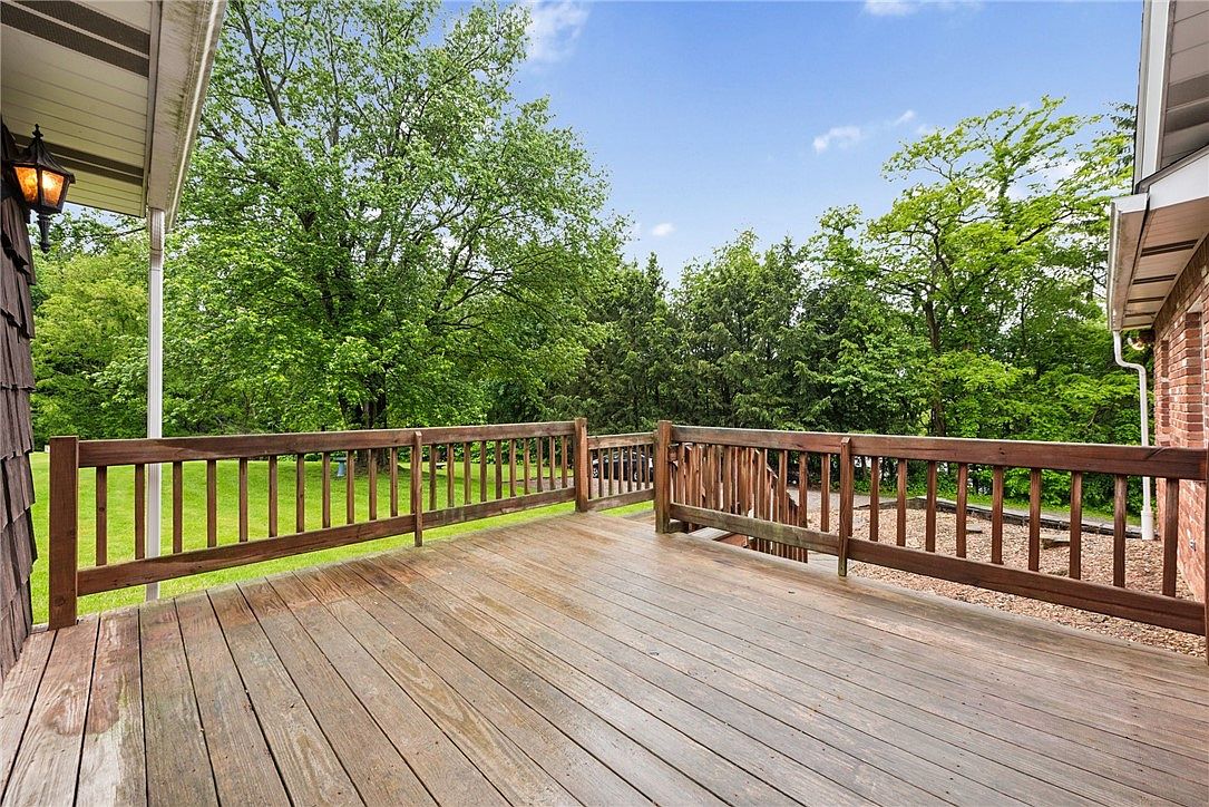 This spacious backyard deck offers an inviting outdoor retreat with its natural wooden planks and sturdy railing, creating a harmonious connection to the surrounding greenery. The railing is constructed from horizontal and vertical wooden slats, enhancing safety without obstructing the lush view. The deck is elevated, providing a clear vantage point of the expansive lawn and mature trees that frame the serene landscape. The house exterior adjacent to the deck reveals a mix of dark siding and red brick, combined with white gutters and overhangs that add subtle contrast. This area is ideal for al fresco dining or relaxation, blending rustic charm with natural beauty.