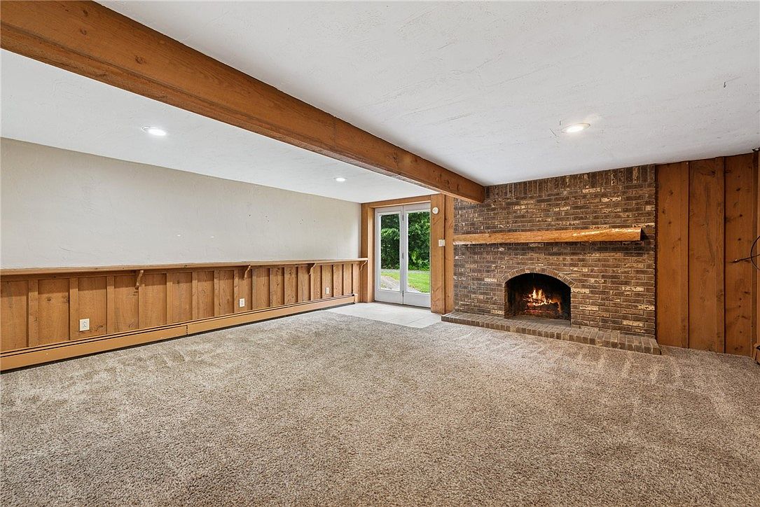 This spacious living room features a warm and inviting design with a dominant rustic feel. The focal point is a large brick fireplace with a wooden mantel, complemented by wood paneling along one wall and a matching exposed beam across the ceiling. Neutral beige carpeting covers the floor, enhancing the cozy atmosphere. Opposite the fireplace, a light wood wainscoting runs under the beige painted upper walls, contributing to a mellow color palette. Glass double doors open to an outdoor space, inviting natural light and greenery inside, creating a peaceful retreat perfect for relaxing.