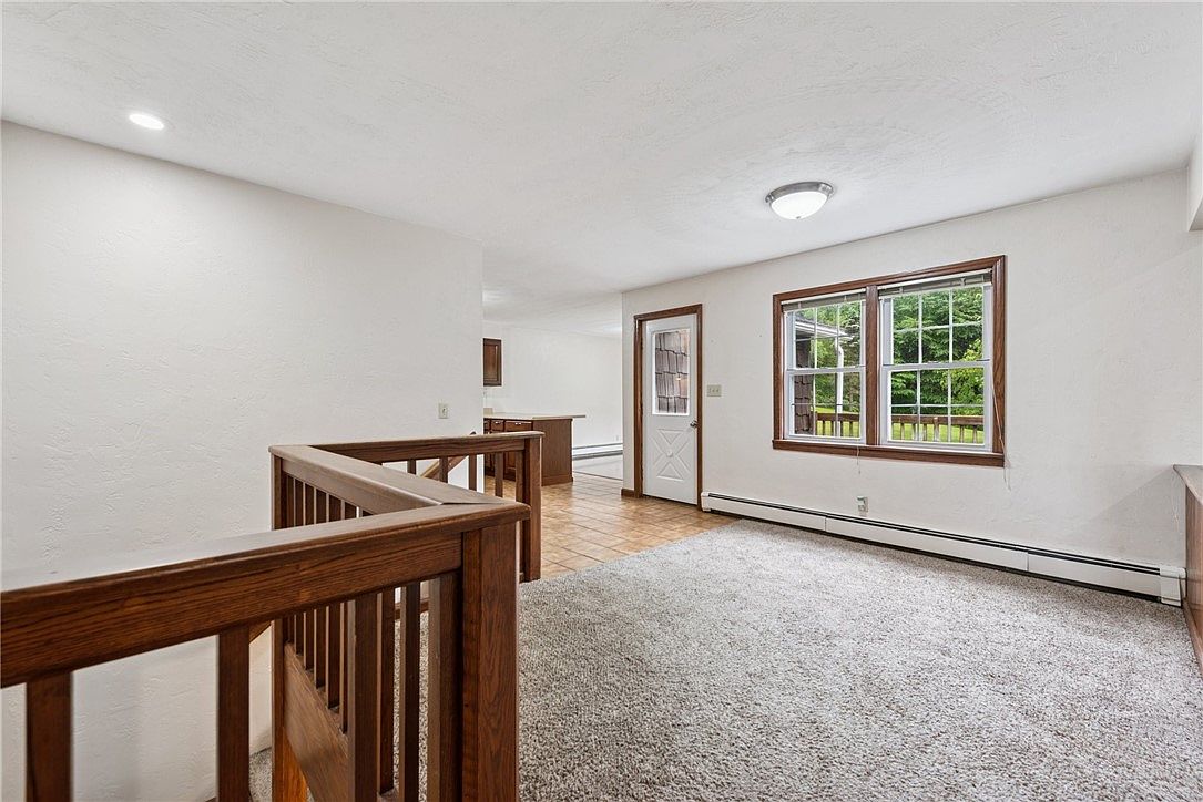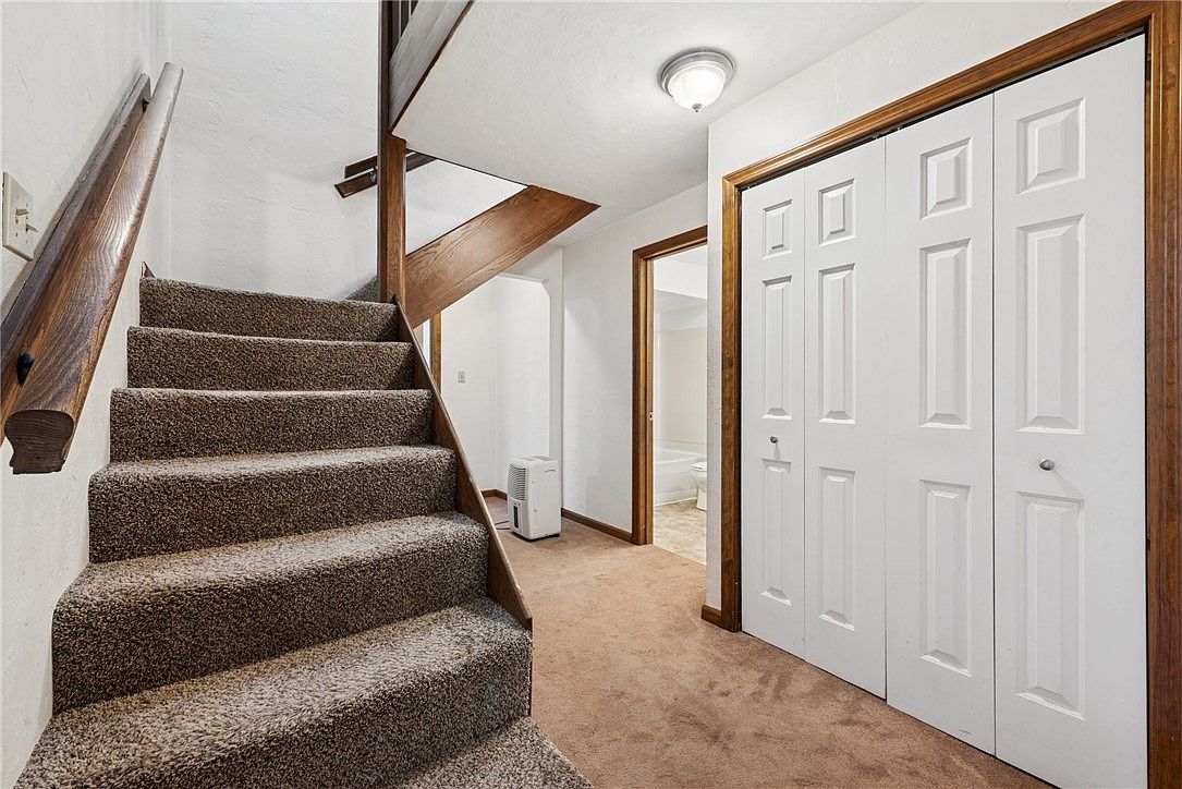 This cozy lower level hallway features carpeted flooring and stairs in a muted brown tone, creating a warm and inviting atmosphere. The walls are painted a clean white, contrasting softly with the medium wood trim framing the doorways and closet. A white closet with paneled doors offers practical storage, while the adjacent doorway leads into a bathroom space, identified by neutral tile flooring and fixtures visible inside. The wooden handrail complements the stairs, and a simple ceiling light fixture provides illumination, enhancing the space’s functional, homey design.