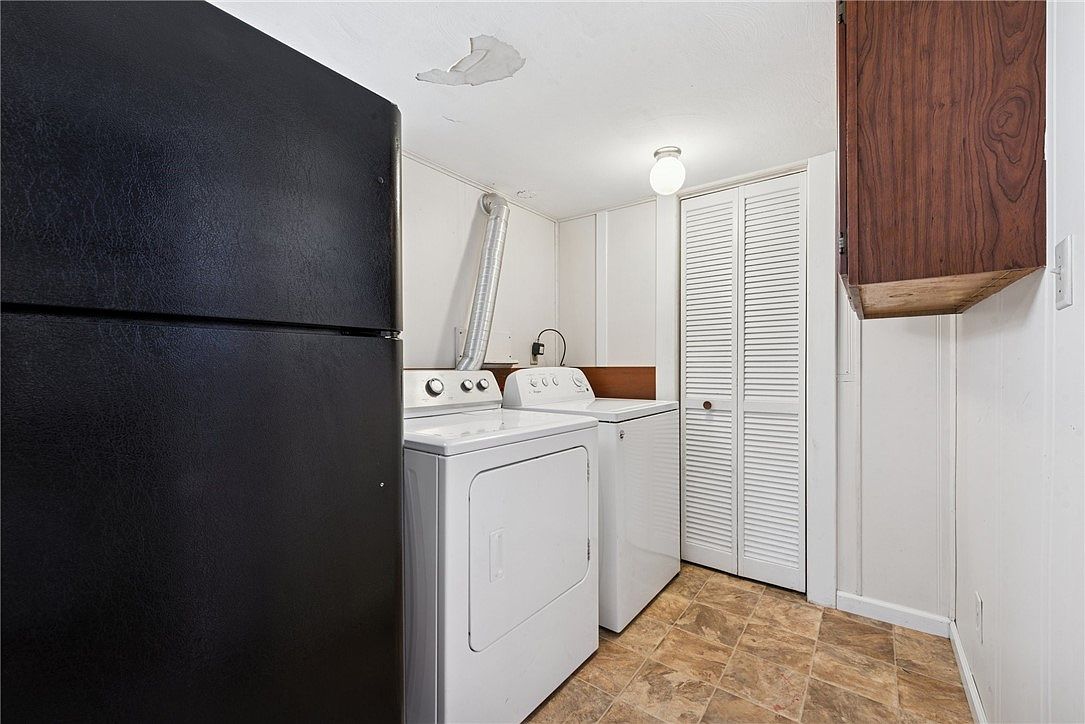 This compact laundry room features a practical layout with a white washing machine and dryer side by side, positioned against a neutral-toned wall with white paneling. A black refrigerator stands to the left, offering additional storage or utility options. The floor has a warm, patterned tile that contrasts subtly with the otherwise light and simple surfaces. A louvered closet door provides access to extra storage space, while a wooden cabinet mounted high on the wall adds functional charm. The ceiling light is modest yet sufficient, and the overall design emphasizes functionality and efficiency in a small footprint.