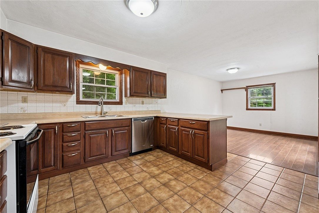 This spacious kitchen features dark wood cabinetry with traditional raised panel doors that contrast nicely against the light beige countertops and tiled backsplash, creating a warm, inviting atmosphere. The floor is covered with square, earth-toned ceramic tiles which extend partially into the adjoining dining area, adding continuity and grounding the space. Stainless steel appliances, including a dishwasher, bring a modern touch. Two windows with wood trim allow natural light to brighten the room, highlighting the clean white walls and ceiling. The open floor plan flows seamlessly into the dining space with wood-look flooring and a simple ceiling light fixture, emphasizing functional simplicity and comfort.