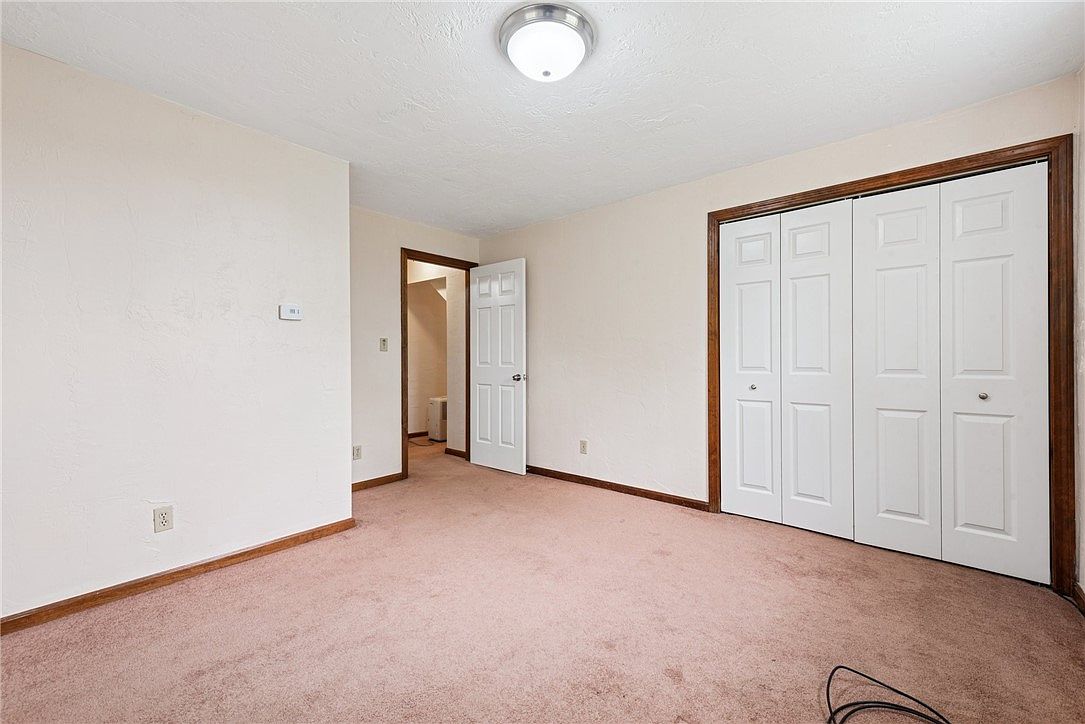 This bedroom area features soft beige walls with a subtle textured finish, paired with warm wood trim accents around the doorframe and closet. The carpet is a muted rose color, adding a cozy feel underfoot. A double bi-fold closet with white paneled doors offers ample storage and is framed by wood trim that matches the door leading to an adjacent room or hallway. The ceiling sports a simple flush-mount light fixture, providing balanced illumination to this modest, straightforward space. The overall design blends warmth and simplicity, ready for personalized furnishings.