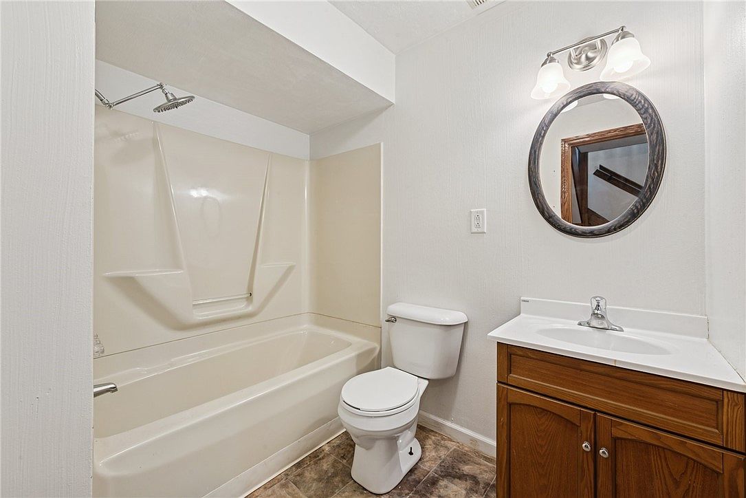 This compact bathroom features a clean and functional layout with an off-white bathtub and shower combination that includes built-in shelves and a modern rainfall showerhead. The walls are painted a soft white, complementing the bathtub and enhancing the room’s bright and airy feel. A classic white toilet sits adjacent to a wooden vanity cabinet with a sleek white countertop and a single faucet sink. Above the sink, a round mirror with a dark wood frame is paired with a two-light brushed nickel wall fixture, adding warmth and a touch of rustic charm to the otherwise simple space. The floor is finished with a neutral-toned tile that blends seamlessly with the overall neutral color palette.