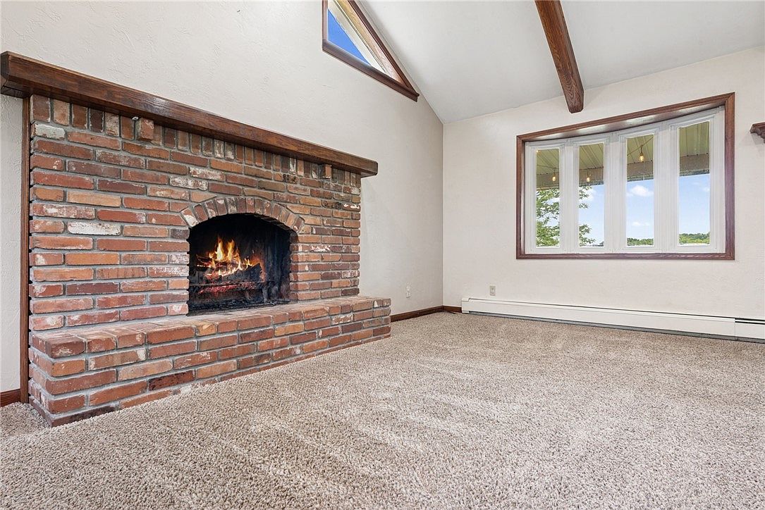 This cozy corner of the living room features a classic brick fireplace with an arched opening and a sturdy wooden mantle that contrasts warmly against the light beige walls. The high vaulted ceiling with exposed wooden beams adds architectural interest and a rustic charm, while the soft, neutral-toned carpet enhances comfort underfoot. A row of large, white-trimmed windows allows natural light to fill the room and offers scenic outdoor views. Baseboard heating lines the walls, blending functionality with the inviting, traditional aesthetic of the space.