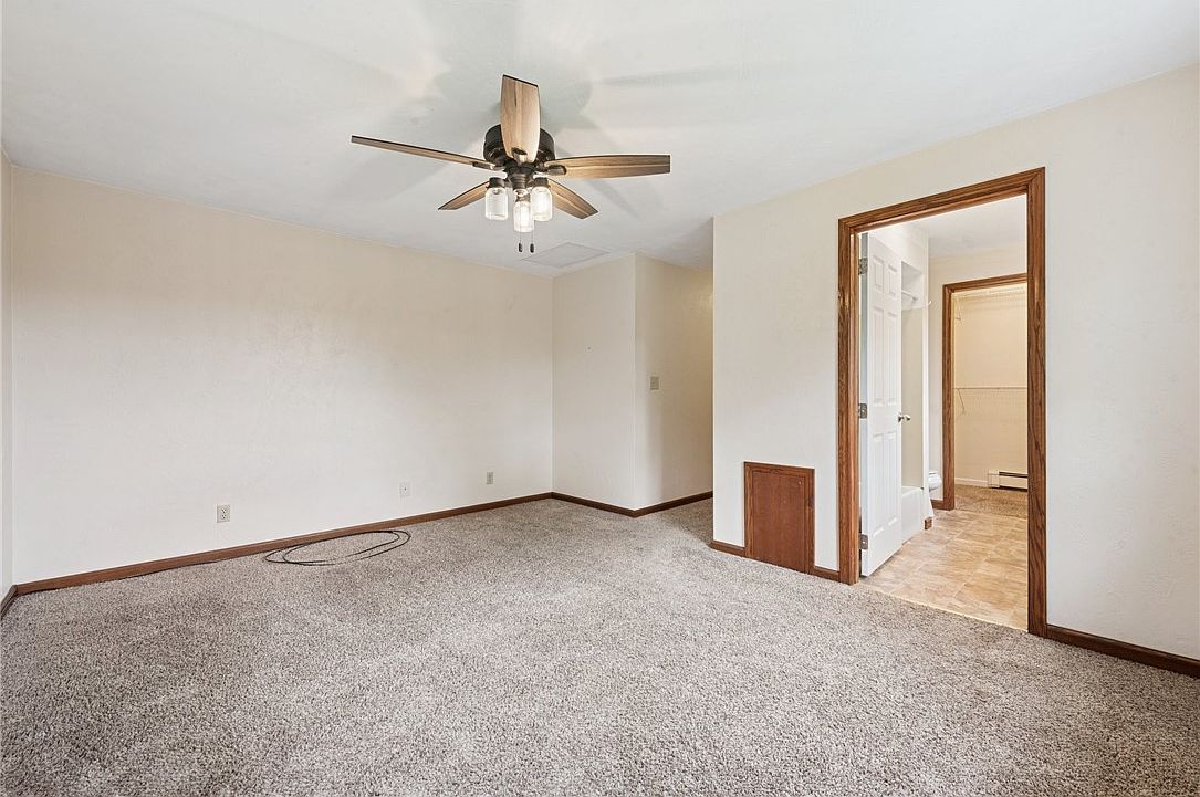 This primary bedroom offers a quiet, neutral space defined by soft beige walls and warm wood trim that adds subtle contrast. Plush, light gray carpeting creates a cozy atmosphere underfoot. The ceiling fan with dark wood blades and three small glass light fixtures centers the room, combining functionality with a touch of rustic charm. A doorway leads to an adjoining bathroom and walk-in closet, highlighted by beige tile flooring for easy maintenance. The room’s simple layout emphasizes versatility, making it an inviting retreat with ample potential for personalized furnishings and décor.