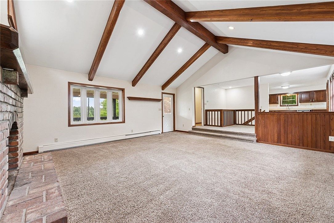 This spacious living room features a vaulted ceiling with exposed dark wood beams, contrasting beautifully against crisp white walls. The large window with a wooden frame invites ample natural light while providing views of greenery outside. A prominent brick fireplace anchors the space on one side, offering a cozy focal point. The carpeted floor adds warmth and comfort underfoot. To the right, a raised area leads into an open kitchen with wood-paneled half walls and cabinetry, creating a seamless flow between living and dining zones. Subtle recessed and ceiling lighting enhance the room’s airy ambiance.