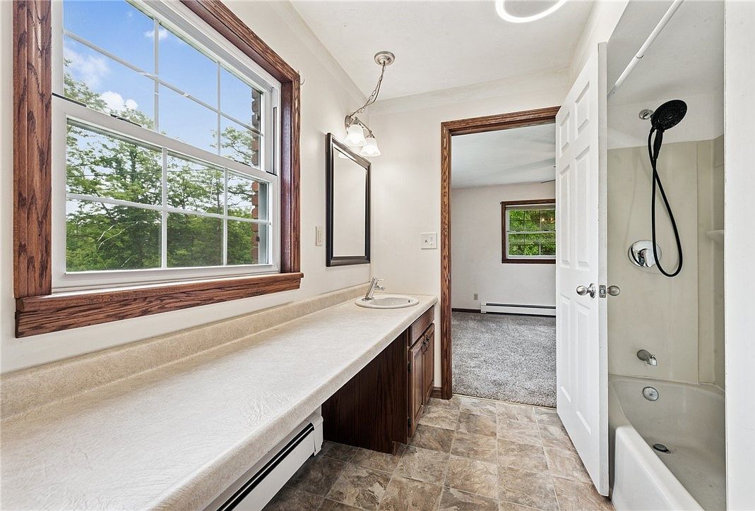 This bright bathroom features a long, light beige countertop with a single sink and a dark-framed mirror above. Natural light pours in through a large window trimmed in rich, medium-toned wood, complementing the wooden cabinetry below the counter. The floor is covered with neutral, patterned tiles that add subtle texture and warmth. To the right, an alcove houses a bathtub with a white surround and a black showerhead, contrasting with the otherwise neutral palette. The bathroom opens directly into a carpeted room with similarly trimmed windows, blending rustic wood accents with a clean, functional design.
