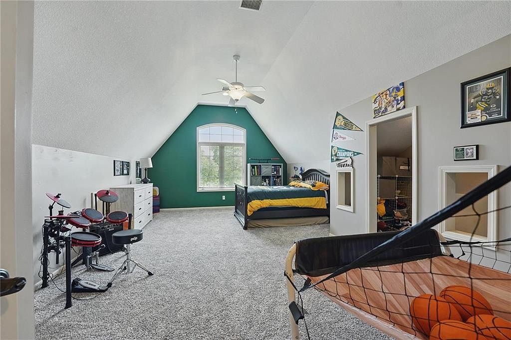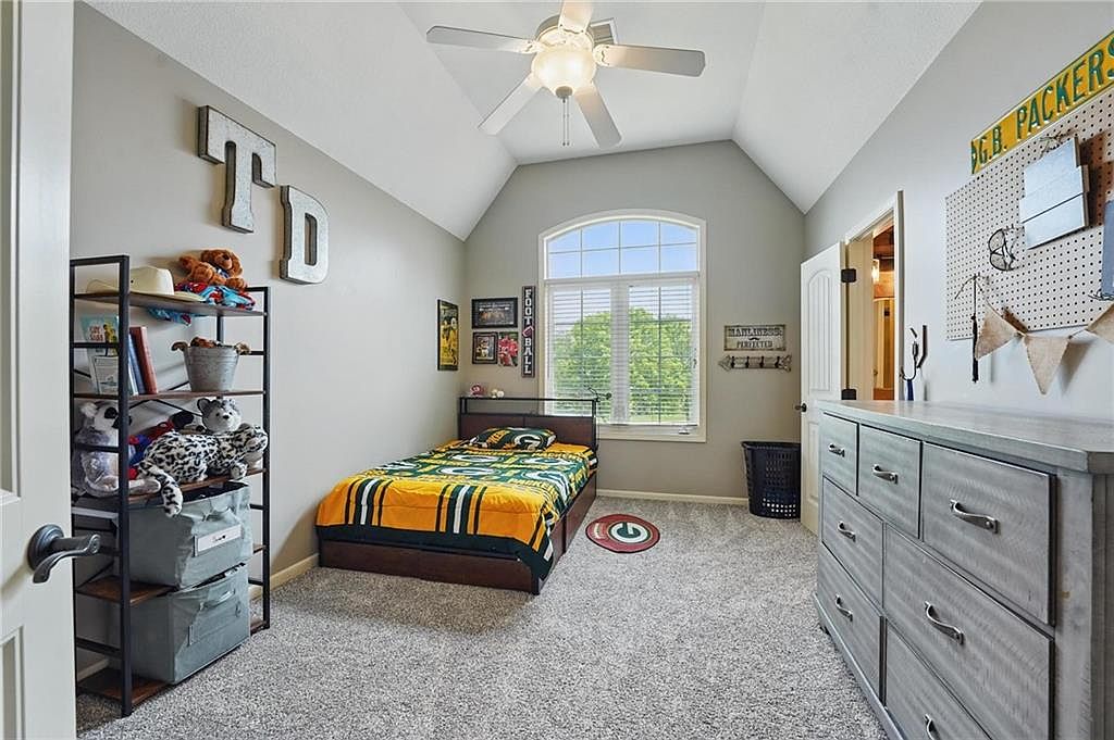 This cozy child’s bedroom features a vaulted ceiling with a white ceiling fan centered above for air circulation. The room is painted in a soft gray tone, which contrasts elegantly with the plush light gray carpet flooring. A single bed sits against the far wall beneath a large arched window with white plantation shutters letting in ample natural light. The bed is adorned with a vibrant yellow and green blanket, highlighting a sports theme further emphasized by framed wall art and a small circular rug on the floor. On the right, a tall wooden dresser with dark metal handles provides storage, while an open black metal shelving unit on the left holds toys and storage boxes. The room’s layout maximizes functionality while maintaining a clean, sports-inspired aesthetic ideal for a young occupant.