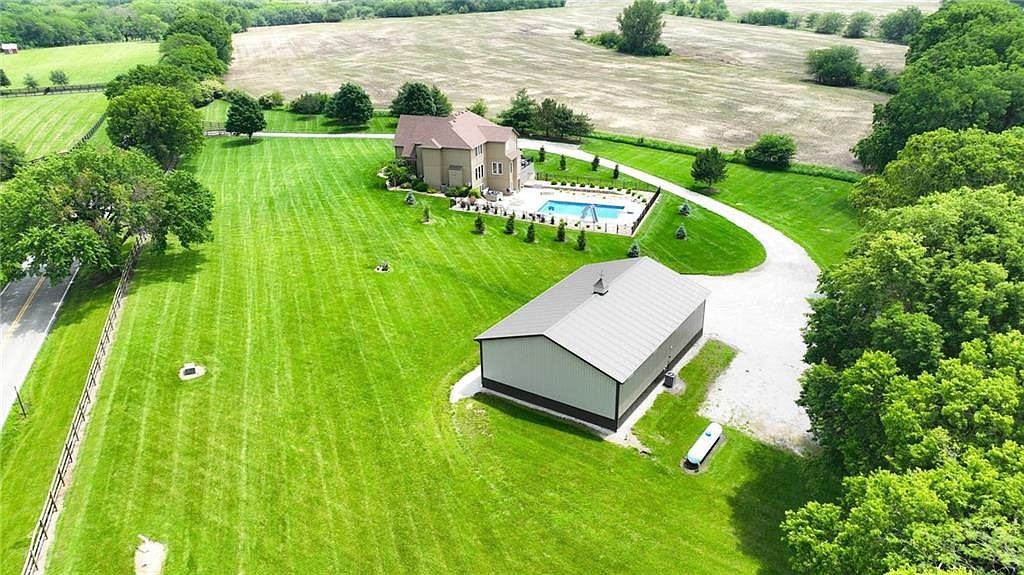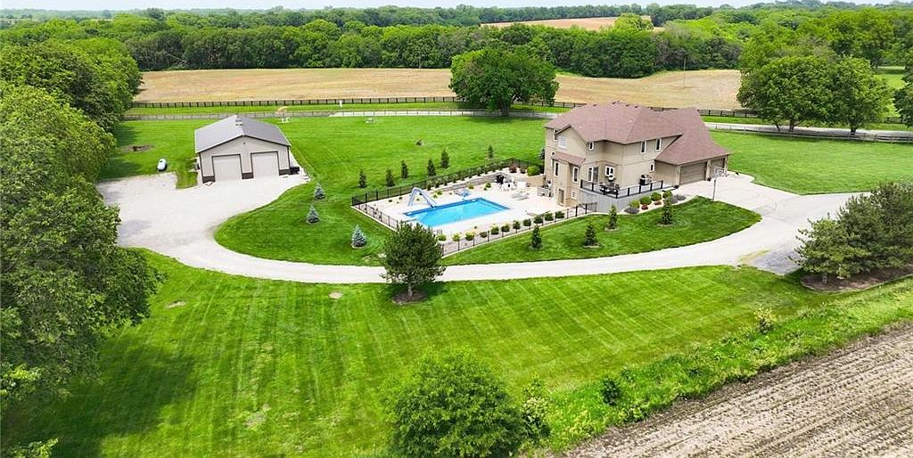 This expansive property features a spacious, well-maintained green lawn bordered by mature trees, providing a peaceful, natural setting. A two-story beige home with a brown roof sits towards the back, accompanied by a large in-ground swimming pool surrounded by a secure fence and poolside seating. A curved gravel driveway winds around the house, connecting to a large detached metal garage or barn with a pitched roof. Neighboring farmland extends beyond the property, emphasizing the secluded, rural atmosphere and making this home ideal for privacy and outdoor enjoyment.