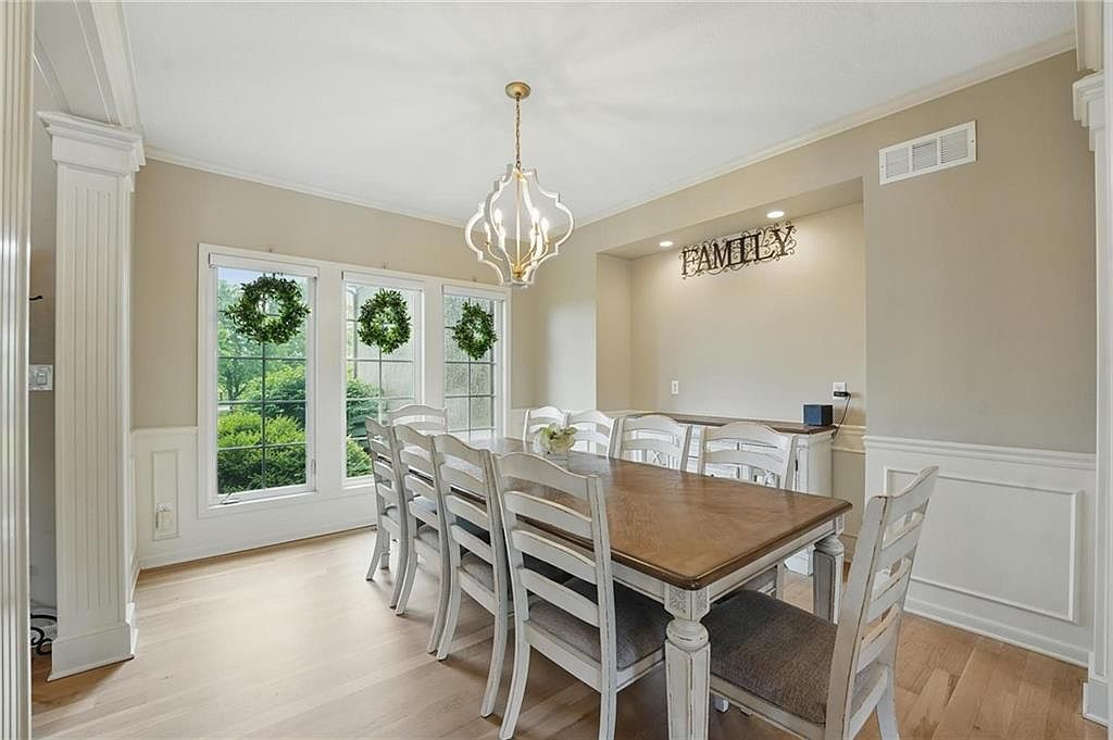 This dining area features a long wooden table with a natural finish paired with whitewashed chairs, carrying a rustic charm. Three large windows on one side let in abundant daylight, accentuated further by simple green wreath decorations that add a touch of nature. The walls are painted in a warm beige tone and are enhanced with classic white wainscoting and crown molding, contributing to the room’s cozy yet elegant feel. A modern chandelier with a subtle gold finish hangs centered over the table, providing soft ambient lighting. A recessed niche with the word “FAMILY” highlights a welcoming atmosphere.