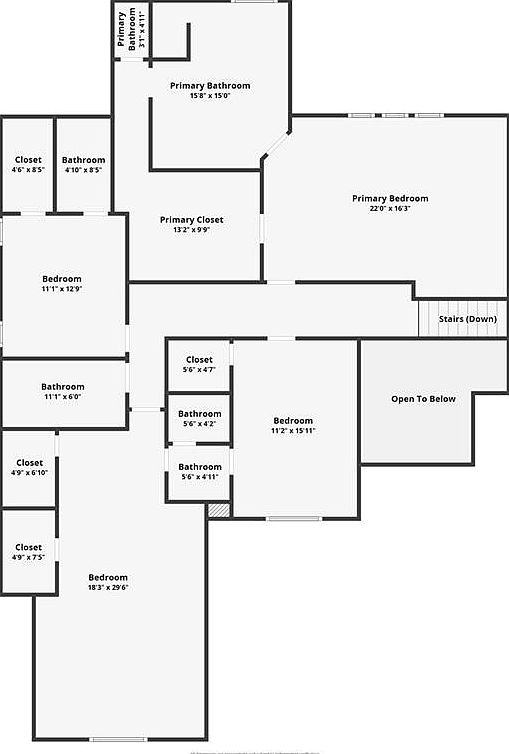 This detailed floor plan highlights the upper level of a spacious home, featuring four distinct bedrooms and multiple bathrooms for comfort and convenience. The large primary bedroom measures 22’0″ by 16’3″ and connects to a generous primary closet and a well-sized primary bathroom, designed for privacy and ample storage. Two other bedrooms share close proximity to their own separate bathrooms, while a fourth bedroom is bordered by two modest bathrooms and closets. The layout also includes open space overlooking the level below and stairs leading down, emphasizing flow and connection between floors.