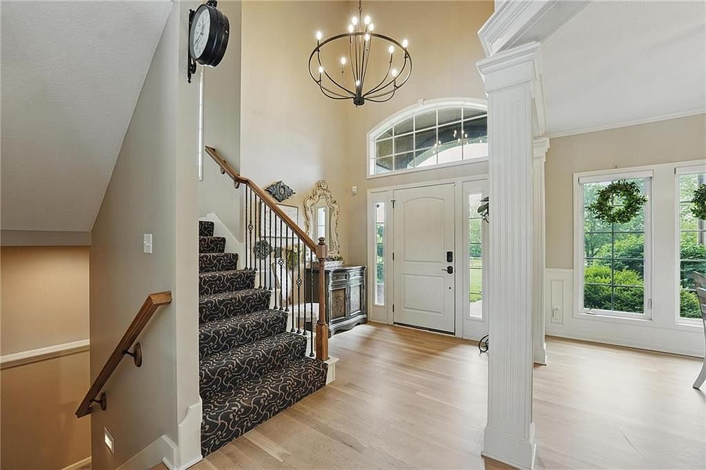 This welcoming entryway features a high ceiling with a contemporary black chandelier that adds an elegant touch. The large white front door is accented by sidelights and a transom window, allowing abundant natural light to fill the space. The hardwood flooring complements the neutral beige walls, creating a warm and inviting atmosphere. A patterned runner carpet covers the staircase, which has classic wooden handrails and black iron balusters, merging traditional and modern styles. Decorative elements like a vintage wall clock, a decorative mirror, and a dark wood console table add charm and function to the space. The open layout transitions smoothly into a bright area with large windows adorned with wreaths, emphasizing a fresh, airy environment.
