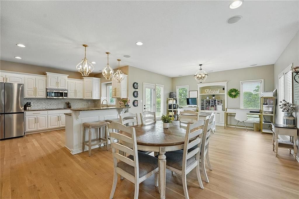 This spacious kitchen and dining area feature an open floor plan with light wood flooring stretching throughout the space. The kitchen boasts white cabinetry with raised panel doors, complemented by sleek stainless steel appliances and a light granite countertop. Three decorative pendant lights hang above the breakfast bar, which includes two wooden stools with cushioned seats. Adjacent to the kitchen is a large, rustic wooden dining table surrounded by six matching, distressed white chairs. Large windows and glass doors flood the room with natural light, creating a bright and inviting atmosphere. A cozy workspace with a desk and shelving is tucked into the corner, highlighted by wall décor and touches of greenery, adding a homey, comfortable feel.