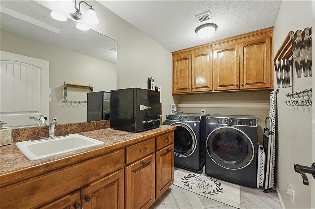 This laundry room offers a practical and inviting space with warm medium-tone wooden cabinets that extend both below the granite-like countertop and above the washer and dryer units for ample storage. The side-by-side front-loading washer and dryer are sleek with a dark finish, resting on a stylish light wood-patterned floor. A deep, white utility sink is integrated into the countertop, providing functionality. Neutral beige walls enhance the cozy, clean atmosphere. Additional features include an ironing board stored vertically, stainless steel towel racks, and soft overhead lighting, creating a well-organized and efficient laundry area.