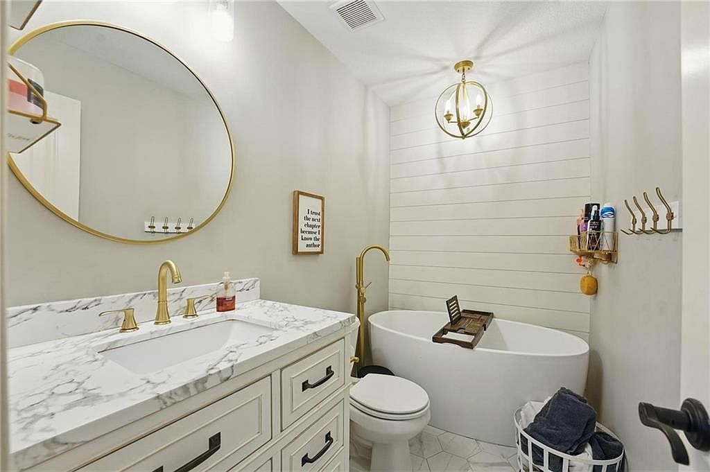 This bathroom features a soft, neutral color palette with white and beige tones that create a clean, calming atmosphere. A large round mirror with a thin gold frame hangs above a white vanity with marble countertops and gold hardware, complementing the gold faucet. The floor features subtle hexagonal tiles with a light pattern. To the right, there’s a modern, freestanding oval bathtub set against a white shiplap accent wall, illuminated by a stylish gold globe chandelier. The space includes a white toilet and practical hooks on the wall, with a basket holding neatly folded towels, emphasizing both elegance and functionality.