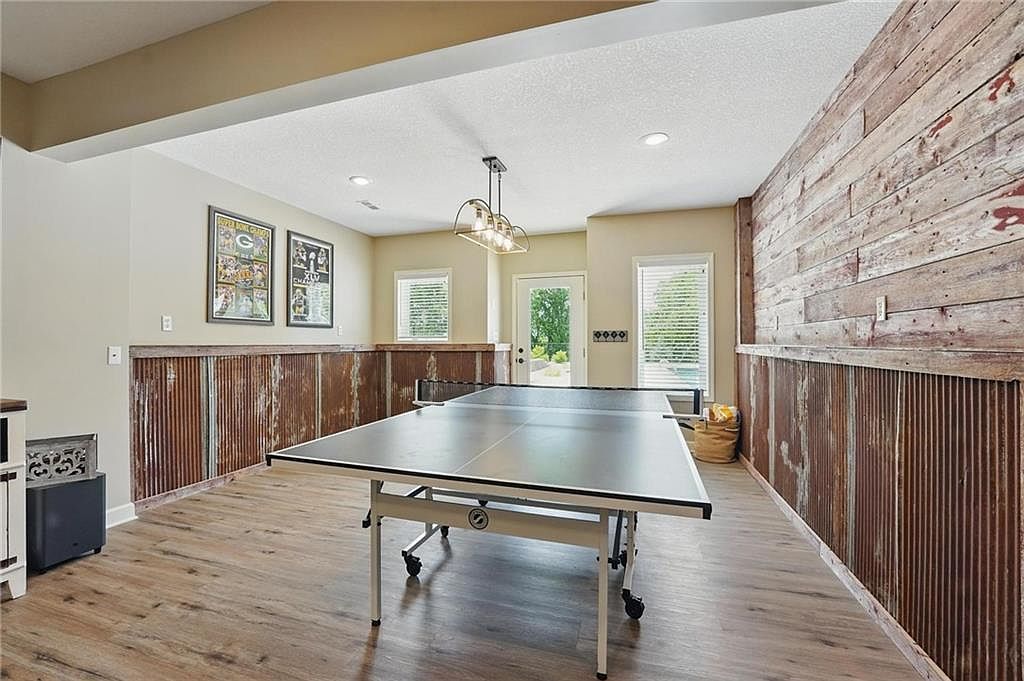 This inviting game room centers around a black ping pong table standing on a warm, wood-tone floor that perfectly complements the rustic wainscoting. The walls feature a combination of textured wood planks and metal panels in a distressed finish, adding a cozy farmhouse charm. Soft beige walls and neutral tones create a warm atmosphere, enhanced by natural light streaming through two vertical windows flanking a glass door that opens to an outdoor view. Sport memorabilia framed on the wall adds character, while a modern pendant light hangs above for focused illumination.