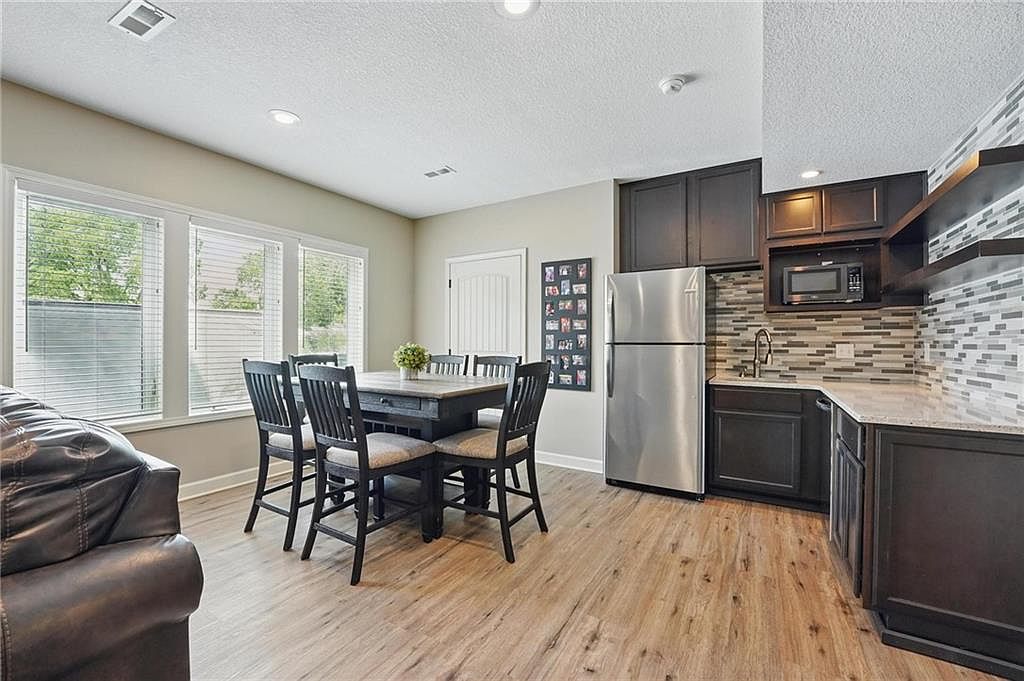 This space blends a cozy dining area with a modern kitchen corner, featuring a clean, neutral palette dominated by warm beige walls and natural wood-toned flooring. The dining set, composed of a dark wood table and cushioned chairs, anchors the room near a trio of large windows offering ample natural light and views to the greenery outside. The kitchen cabinets, finished in deep espresso, contrast beautifully with the light, patterned subway tile backsplash and sleek stainless steel appliances, including a refrigerator and microwave. Open shelving adds practical storage, while recessed ceiling lights provide bright, even illumination, creating a welcoming yet functional environment.