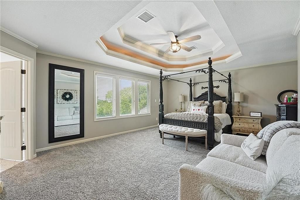 This spacious master bedroom features a regal black four-poster bed that stands as the room’s focal point, paired with a plush textured bench at its foot for added comfort and style. Neutral beige walls complement the soft gray carpeting that adds warmth and coziness. A large, wall-mounted mirror near three bright, wide windows allows natural light to flood the space, enhancing its airy feeling. The tray ceiling with soft, ambient lighting and a modern ceiling fan adds architectural interest. Comfortable seating is provided by a cushioned white love seat with decorative pillows, merging luxury and relaxation seamlessly.