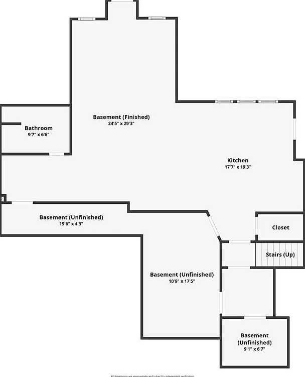This basement layout features a combination of finished and unfinished areas, providing versatile space for various uses. The largest finished section measures 24’5″ by 29’3″, offering ample room that can serve as a family or recreation room. Adjacent to this is a spacious kitchen area sized 17’7″ by 19’3″, suggesting it might be a basement kitchenette or an additional cooking space. The floor plan also includes multiple unfinished sections of differing sizes, potentially suitable for storage, workshops, or future development. A bathroom sized 9’7″ by 6’6″ is conveniently located nearby. There is a closet and stairs leading up to the main house, emphasizing the practical and functional design of this basement space.