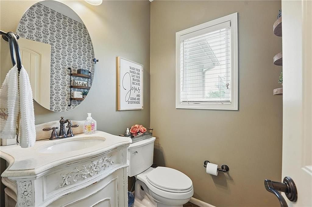 This cozy powder room combines classic charm with functional design. The soft taupe walls create a warm, inviting atmosphere contrasted by the bright white trim and window frame, allowing natural light to gently illuminate the space. An ornate, vintage-style vanity with detailed carvings and a creamy marble countertop hosts an oil-rubbed bronze faucet, adding elegant character. A large round mirror above reflects a subtle patterned wallpaper visible through the doorway, contributing texture and visual interest. Accessories include a hand towel hanging on an antique bronze ring, a floral accent on the toilet tank, and a framed sign emphasizing thoughtful, homey touches.