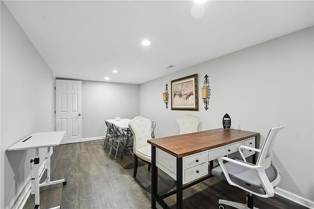 This space combines a practical home office with a small meeting area, ideal for work or collaborative tasks. The room features light gray walls that provide a neutral backdrop, complemented by the dark, wood-look laminate flooring which adds warmth and contrast. On one side, a wooden desk with a white distressed base and black legs is paired with a modern white office chair, blending rustic charm with contemporary comfort. Opposite, a simple folding table is surrounded by four black folding chairs, perfect for group seating. Decorative elements include an ornate framed artwork and symmetrical wrought iron sconces with candles, adding an elegant, classic touch. Recessed ceiling lights brighten the space evenly, emphasizing its clean lines and functional layout.